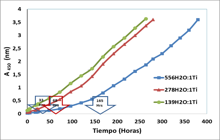 En las curvas cinéticas de formación de los TOHAC obtenidas a partir del seguimiento de la absorción a 450 nm de los espectros de UV – Vis a las diferentes relaciones molares [H2O]/[Titanatrano] (Figura Nº 3), se observa claramente dos etapas diferentes de cambios de absorbancia. Al inicio de la reacción, la variación de la absorbancia es baja (ΔA450) con incremento lento a medida que aumenta el tiempo, en este primer periodo se produce la formación y crecimiento de los núcleos primarios de TOHAC hasta un tamaño crítico (concentración critica). En la segunda etapa, el incremento en la variación de la absorbancia es alta en consistencia con un incremento en el tamaño de los TOHAC, sea por procesos de condensación de los TOHAC primarios o por agregación de los mismos. Finalmente se ha observado en los sistemas en estudio, una tercera etapa de reacción que promociona los procesos finales de condensación y agregación de las nano – micropartículas formadas concretizando la formación de soles y geles en función de la relación molar de H2O/ Titanatrano (19 días para la formación de un gel para la relación molar 139, 60 días para la formación de un gel en la relación molar de 278, y queda en suspensión las partículas formadas para la relación molar de 556).