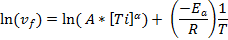 Donde k es la contante de velocidad, [Ti] es la concentración de titanatrano, y 𝞪 es el orden de reacción. Combinando estas ecuaciones se tiene: