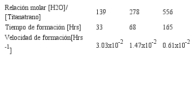 El análisis de los resultados obtenidos indica que a medida que la relación molar H2O/Titanatrano se incrementa, el tiempo de inducción se incrementa, por tanto la velocidad de formación de los núcleos primarios disminuye. El comportamiento de los tiempos, y velocidades de formación es totalmente opuesto a lo reportado por distintos autores [8-14] en sistemas donde se evalúa los procesos de hidrolisis y condensación de alcóxidos de titanio. En éstos, las propiedades de los alcóxidos de titanio obliga a utilizar como disolvente un alcohol, y las relaciones molares de agua/alcóxido (h) son muy bajas (0.1 hasta 19) logrando de esta manera regular los procesos de hidrólisis y condensación en la formación de clúster de oxo – alcoxo de titanio.