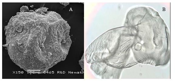 Microfotografía óptica (A) y de barrido (B) de partículas de alginato de calcio. Las deformaciones son causadas por la deshidratación (microscopio electrónico de barrido, cortesía de Nemak).