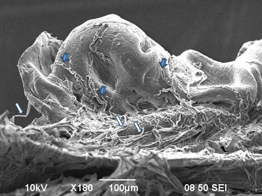 Microscopia electrónica de barrido de raíz de maíz en interacción con Azospirillum brasilense liberada de microcápsula de alginato, donde se observan células de la bacteria (flechas gruesas, azules) en contacto con pelos radiculares de la raíz de maíz (flechas delgadas, blancas). Los cuerpos están colapsados por la deshidratación de la muestra.