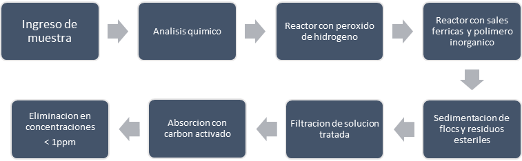 Las reacciones que se consideran para tales fines son la reacción con peróxido de hidrógeno, y la precipitación de complejos cianurados y metales pesados, estos procesos se complementan con la filtración de la solución tratada.