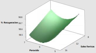 Gráfica de superficie de % de recuperación vs. sales férricas, H2O2 [3]