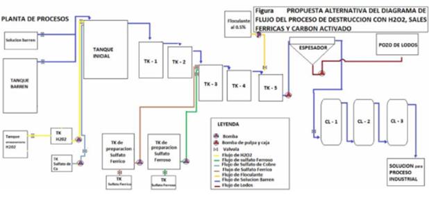 El proceso de eliminación de cianuros de los efluentes líquidos junto con metales pesados producto de la lixiviación, ocurre mediante la formación de complejos de cianuro con medios acomplejantes de mayor potencial como el sulfato férrico y el sulfato ferroso; estos actúan formando una cadena pesada, la adición de peróxido de hidrogeno acompleja sobre todo los elementos contaminantes de las soluciones permitiendo la formación de flocs por la presencia de cargas eléctricas en el medio.
