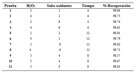 Con los valores de las variables se procedió a codificar el modelo del diseño experimental, observándose; un alto nivel en recuperaciones, confirmando la eficiencia del método empleado.