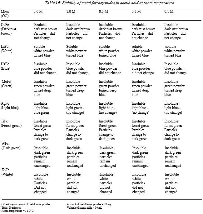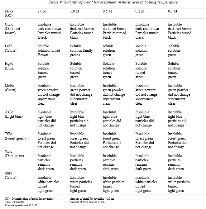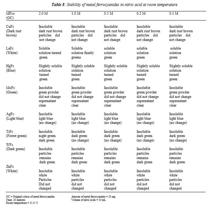 The metal ferrocyanides (20 mg) were placed in the test tubes containing 10 mL of each 2.0 M, 1.0 M, 0.5 M, 0.2 M and 0.1 M acids (hydrochloric acid, sulphuric acid, nitric acid and acetic acid). The mixture was agitated for 20 minutes at room temperature and observation for any change in colour of metal ferrocyanides were recorded (Tables 4, 6, 8. 10). The same reaction mixture boilling on a Bunsen flame for 20 minutes and any change in colour of metal ferrocyanides were recorded (Tables 5, 7, 9, 11). This process was repeated for each metal ferrocyanides. The colour change for ferrocyanides metallic was recorded. All procedures for silver ferrocyanide were carried out in the dark.