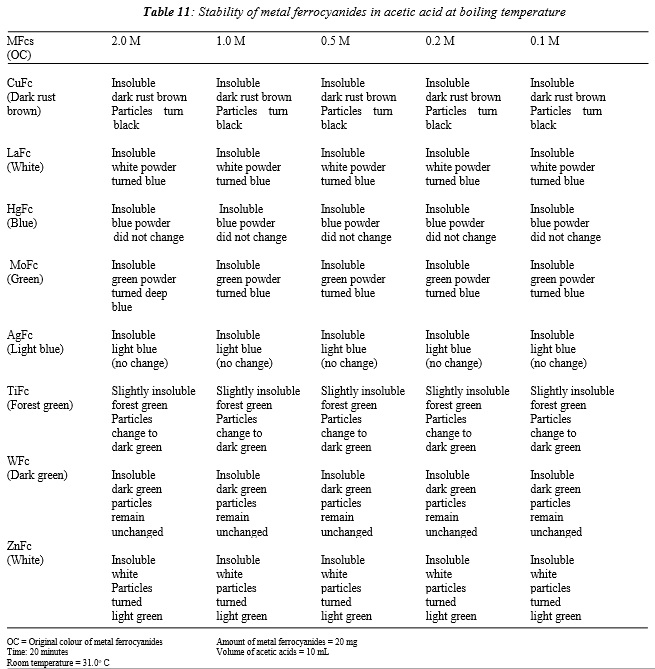 It is observed from Table 10 that mercury, tungsten, copper and zinc ferrocyanides are insoluble in various concentrations of acetic acid at room temperature with no change in colour of particles. Silver, titanium, lanthanum and molybdenum ferrocyanides are insoluble in various concentrations of acetic acid at room temperature with colour change of the particles.