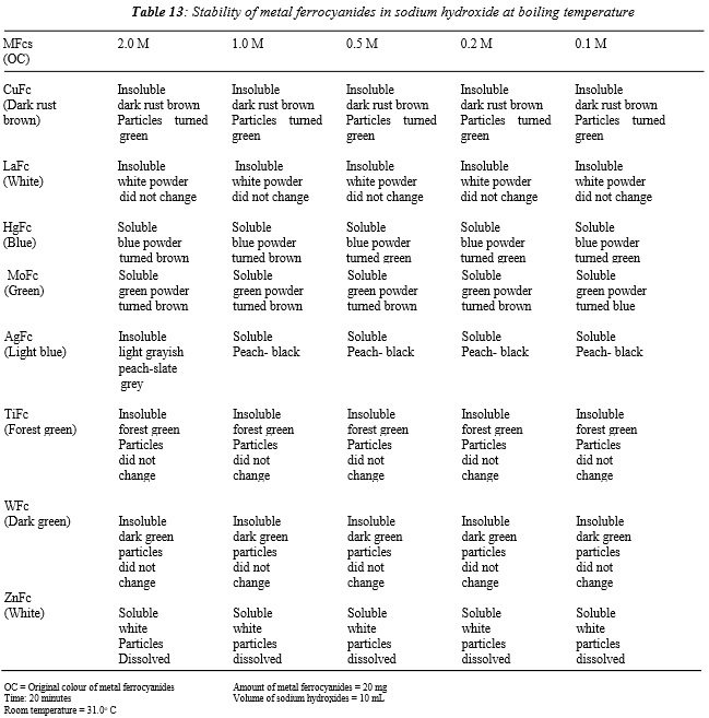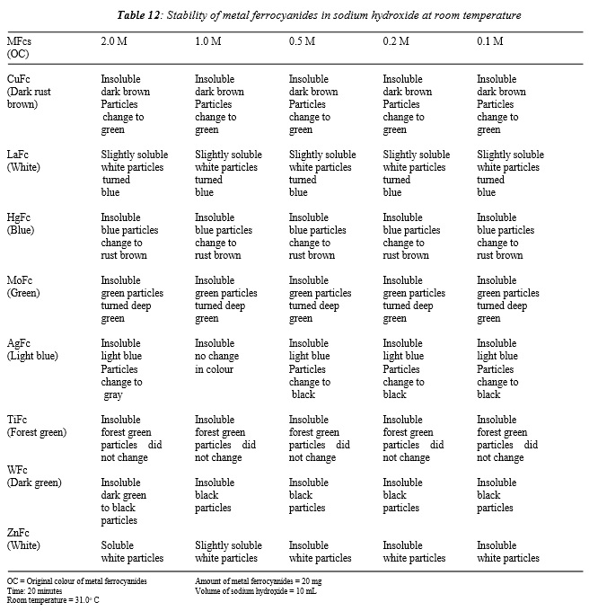 Table 12 show that copper, tungsten, silver, molybdenum, mercury ferrocyanides are insoluble in various concentrations of sodium hydroxide at room temperature with no change in the original particles. Titanium ferrocyanide is insoluble in various concentrations of sodium hydroxide with no colour change in the original particles. Zinc ferrocyanide is soluble in high concentration and insoluble at low concentration of sodium hydroxide at room temperature. The lanthanum ferrocyanide is slightly soluble at all concentrations of sodium hydroxide at room temperature with colour change in the particles.