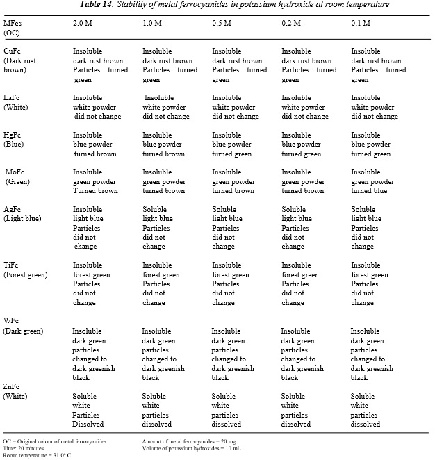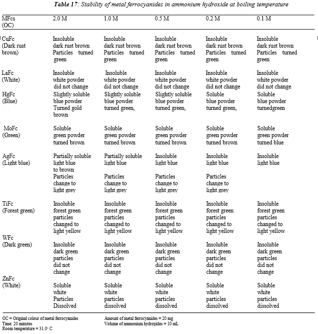 Table 15 showed that copper, tungsten, mercury, molybdenum and tungsten ferrocyanides are insoluble in boilling potassium hydroxide with change in colour of the original particles. Zinc ferrocyanide is soluble in various concentrations of boilling potassium hydroxide. Titanium and lanthanum ferrocyanides are insoluble in various concentrations of boilling potassium hydroxide with no change in colour of original particles.