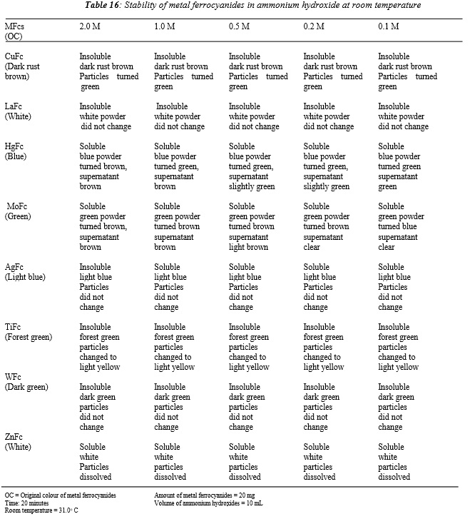 It is observed from Table 16 that copper and titanium ferrocyanides are insoluble in various concentrations of ammonium hydroxide at room temperature with no colour change in particles. Molybdenum and zinc ferrocyanides are soluble in various concentrations of ammonium hydroxide at room temperature. Silver, tungsten and lanthanum ferrocyanides are insoluble in various concentrations of ammonium hydroxide at room temperature with no change in colour. Mercury ferrocyanide is soluble in high concentrations of ammonium hydroxide and insoluble at low concentration of ammonium hydroxide at room temperature.