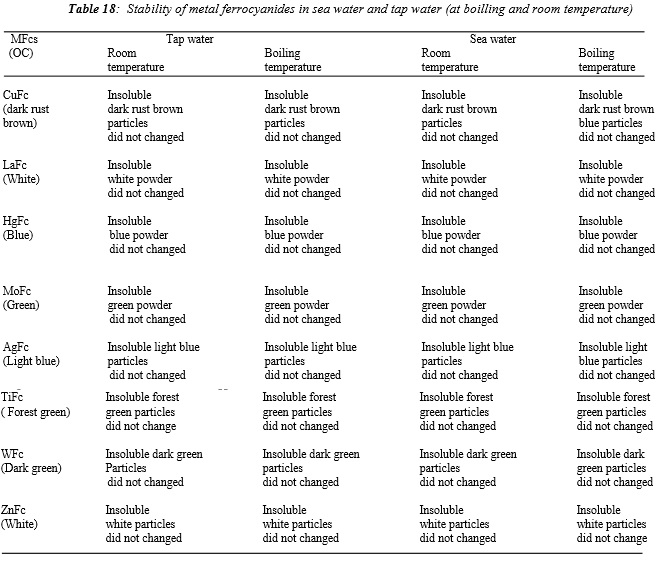 Table 18 showed that all eight copper, lanthanum, mercury, molybdenum, silver, titanium, tungsten and zinc ferrocyanides are found to be insoluble and stable in tap water and sea water at room and boiling temperature.
