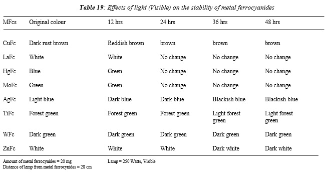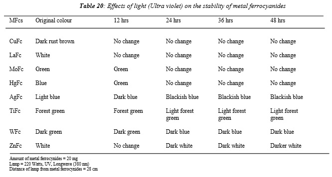 It is observed from Table 19 that tungsten, lanthanum, molybdenum and mercury ferrocyanides are stable to visible light until the 48 hours of radiations. Copper and silver ferrocyanides are unstable to visible light until the 12 hours of irradiation, it is also clear from Table 19 that zinc and titanium ferrocyanides are found stable to visible light 24 hours of irradiation.