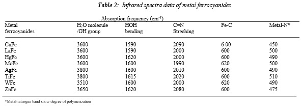 Copper, lanthanum, mercury, molybdenum, silver, titanium, tungsten and zinc ferrocyanides are dark rust brown, white, blue, green, light blue, forest green, dark green and white, respectively. The double metal ferrocyanides are amorphous insoluble solid and showed no X-ray pattern. The metal ferrocyanides are characterized on the basis of elemental and spectral studies. The percentage composition of metals was determined by IL-751 atomic absorption spectrophotometer [25]. Carbon, hydrogen and nitrogen analysis were carried out by CEST-118, CHN analyzer. Percentage composition of elements in the metal ferrocyanides are given in Table 1.