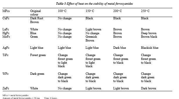 A 20 mg of each metal ferrocyanides was placed in a petri dish. The petri dishes were then placed in the air oven for 6 hours at 100oC. This process was repeated at 150o C, 200oC, and 250oC to demonstrate the effect of heat on the various metal ferrocyanides. The colour of metal ferrocyanides at various was carried temperatures was observed (Table 3). All procedure for silver ferrocyanide was carried out in the dark.