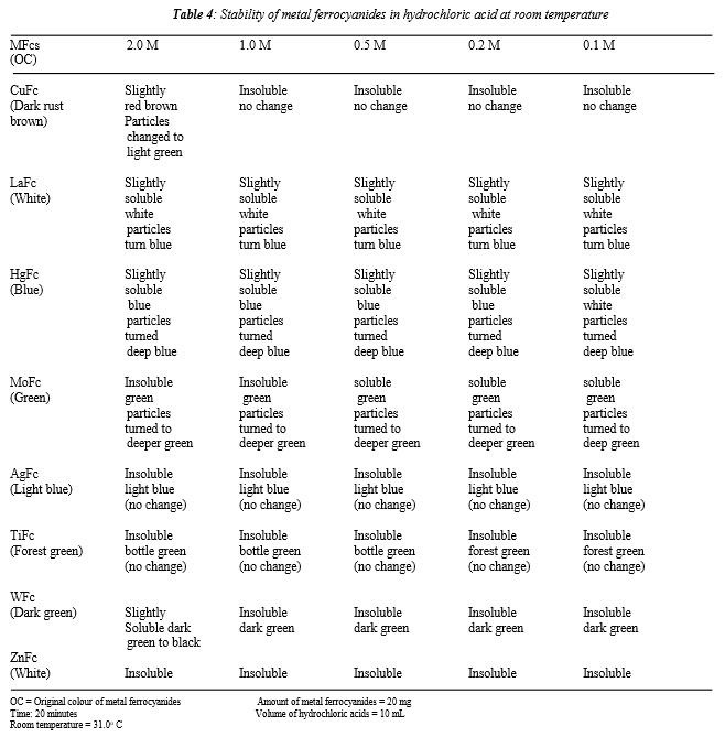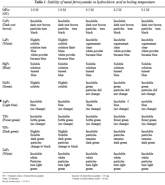 It is clear from Table 5 that copper and zinc ferrocyanides are insoluble in various concentrations of boilling hydrochloric acid with colour change of particles. Silver and titanium ferrocyanides are insoluble in various concentrations of boilling hydrochloric acid with no colour change of particles. Mercury ferrocyanides is soluble at all concentrations of boilling hydrochloric acid. Lanthanum, molybdenum and tungsten ferrocyanides are slightly soluble at high concentrations of boilling hydrochloric acid and insoluble at low concentrations of boilling hydrochloric acid with no colour change of particles.