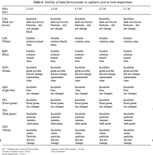 Table 6 shows that copper, zinc, silver, titanium, molybdenum, tungsten ferrocyanides are insoluble in various concentrations of sulfuric acid at room temperature with no colour change of particles. Lanthanum ferrocyanide is soluble in various concentrations of sulfuric acid at room temperature with colour of solution blue and clear at high and low concentrations, respectively.