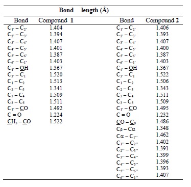 From the structural data, it was observed that the C–C and C–O bond distances calculated are found to be nearly the same for both, 1 and 2. The influence of the substituent on the molecular parameters, particularly the bond distance of CH3–CO of 1 and CO–Cb of 2, seem to be negligibly small.