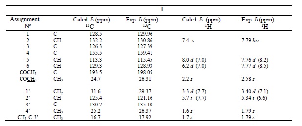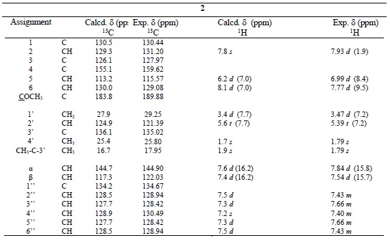 Comparison of experimental signals of 1H-NMR and 13C-NMR (in ppm) with computed values of compounds 1 and 2 are shown in Tables 3 and 4. From the perusal of these tables it is concluded that there is a good correlation ship between the experimental and theoretical chemical shifts, being therefore an excellent predictive ability of the method applied in the case of compounds 1 and 2.