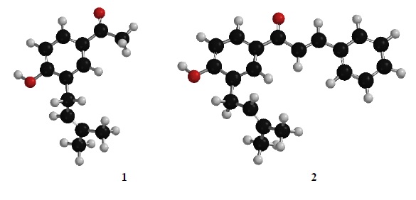 The natural compound 1, 4-Hydroxy-3-(3’-methyl-2’-butenyl)acetophenone isolated from Senecio graveolens [4] was studied with regard to the vibrational and electronic properties which were determined by combining experimental data and quantum calculations [5]. This structural study of 1, was based on normal analysis and vibrational spectra [6].
