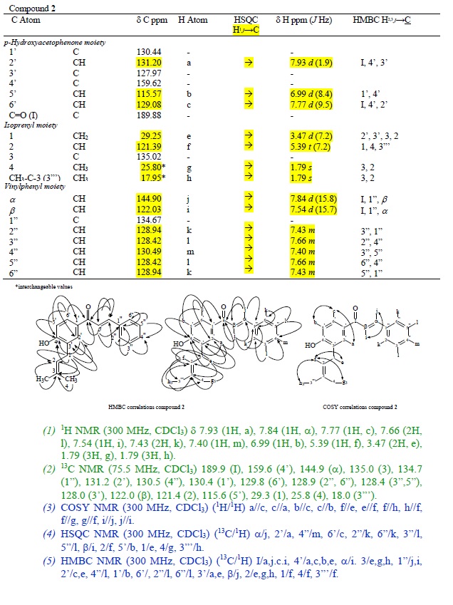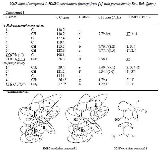 All equipment belongs to Department of Chemical Sciences UMSA; NMR spectrometer: Bruker DRX300, (300 MHz, 75 MHz), TMS used as internal standard. The chemical shifts, ppm, are referred to TMS as an internal standard. The following measurement techniques were used: standard 1H-, attached proton test (APT), Correlation Spectroscopy (COSY), and Heteronuclear Single Quantum Coherence (HSQC) and Heteronuclear Multiple Bond Correlation (HMBC) spectroscopy.