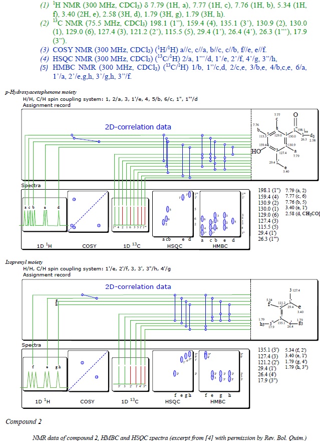 Resumen: Utilizando la teoría funcional de la densidad, se realizó el estudio espectral asistido por computadora de los desplazamientos (d) químicos de RMN 1H y 13C, y de algunas otras propiedades moleculares de la 4-hidroxi-3-(3-metil-2-butenil)acetofenona 1 y de la 4'-hidroxi-3'-(3-metil-2-butenil)chalcona 2. El compuesto 1 fue aislado en un trabajo previo de las partes áreas de Senecio graveolens y su derivado sintético 2 fue obtenido por irradiación con microondas de 1 con benzaldehído, tal como lo publicaron previamente los autores. Los cálculos arrojaron resultados confiables que están en buena correlación con los datos experimentales. Esta es una buena base para la colaboración entre químicos experimentales y cuánticos. Siguiendo las tendencias actuales en la descripción de datos de RMN para moléculas pequeñas, para su lectura y almacenamiento de datos de correlación 2D accesibles por computadora y humanos, resumimos los datos experimentales de RMN 1D y 2D de 1 y 2.