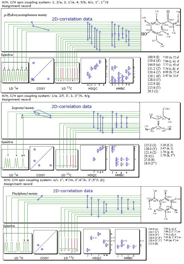 Abstract: The spectral computer-assisted study of 1H and 13C NMR chemical shifts (d), and some other molecular properties of 4-hydroxy-3-(3-methyl-2-butenyl)acetophenone 1 and 4’-hydroxy-3’-(3-methyl-2-butenyl)chalcone 2 was carried out by using the density functional theory. Compound 1 was isolated from Senecio graveolens and its synthetic derivative 2 obtained by microwave irradiation of 1 with benzaldehyde, as previously published by the authors. The calculations yielded reliable results that are in good correlation with the corresponding experimental data. This is a good basis for collaboration between experimental and quantum chemists. Following current trends in NMR data description for small molecules, for its human- and computer-accessible 2D correlation data computer reading and storing, [1] we summarized the 1D and 2D NMR experimental data of 1 and 2.