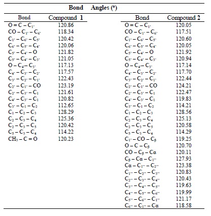 The bond angles calculated are very similar to each other in these molecules. An investigation of the bond angles O=C–C1’, C2’–C1’–CO, CO–C1’–C6’, C1’–CO–Cβ, O–C–Cβ and CO–Cβ–Cα showed that these atoms posses a hybrid configuration sp2 trigonal planar.