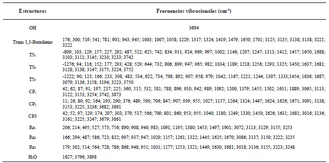 Frecuencias vibracionales calculadas al nivel de teoría B3LYP/aug-cc-pVTZ de las estructuras involucradas en la abstracción de los hidrógenos del trans 1,3-butadieno