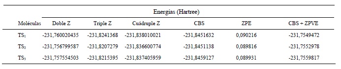 Las energías de los TS para los distintos canales de abstracción de hidrógenos se detallan en la Tabla 3. Comparando las energías de las estructuras correspondientes a los estados de transición con las energías de los reactivos, se determina que los canales de abstracción poseen energías de activación negativas. Estas energías de activación negativas sugieren la formación de complejos Van der Waals pre y pos reactivos.