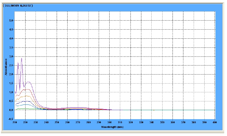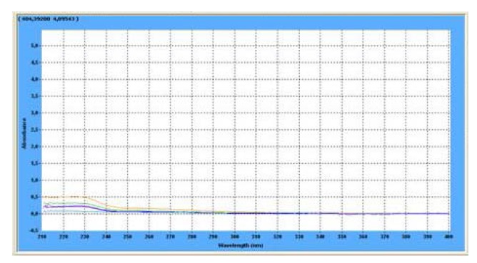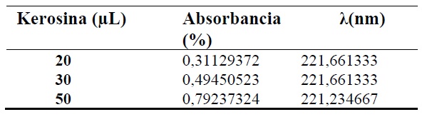 Para medir la absorbancia en la muestra patrón de kerosina se utilizaron diferentes fracciones, 20 (curva azul claro), 30 (curva azul fuerte) y 50 (curva anaranjada) µL. El mayor valor se obtuvo para la fracción de 50 µL de kerosina, a una longitud de onda de 221,234667 ƞm.