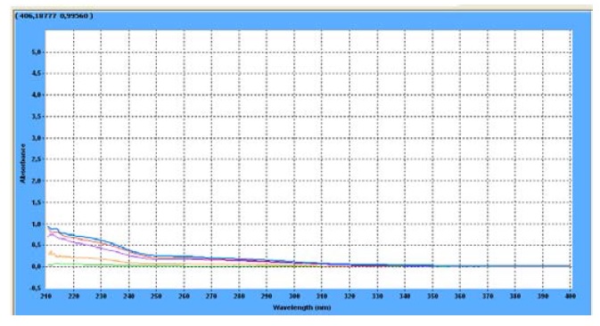 Para determinar la absorbancia a la muestra patrón de Aceite de Motor se utilizaron proporciones de 5 (curva azul) ,10 (curva violeta), 20 (curva verde) y 30 (curva anaranjada) µL respectivamente. El mayor valor se obtuvo para la proporción de 30 µL de Aceite de Motor, trabajando a una longitud de onda de 211,848 ƞm.