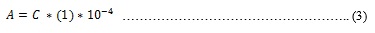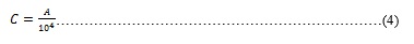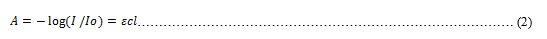 A través de esta ecuación se calcula el valor de concentración, utilizando un valor de coeficiente de absorción molar, reportado en, de ξ=10-4 mol*L-1*cm-1, siendo 1cm el valor de camino óptico (ancho de la cubeta). Sustituyendo se obtiene:
