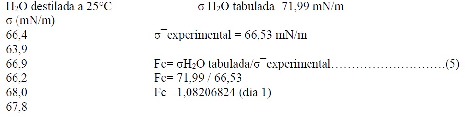 Esta determinación se basa en la comparación entre el valor de tensión superficial del agua destilada tabulado en la bibliografía y los valores obtenidos al analizar el agua antes de comenzar a trabajar y así corregir las irregularidades que pueda tener el equipo [23].