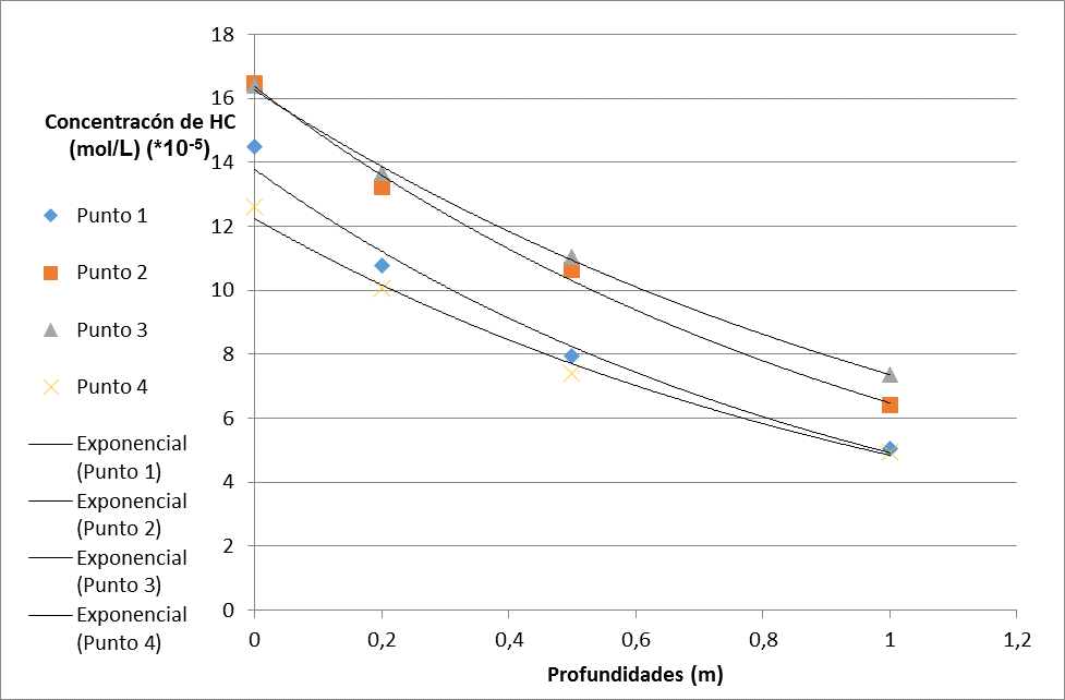 Todas las curvas tienen el mismo comportamiento, la concentración de HC es inversamente proporcional a las profundidades, la línea de tendencia exponencial que describe la correspondencia, posee una ecuación de correlación con un valor aproximado de R2=0,99 para todos los casos.