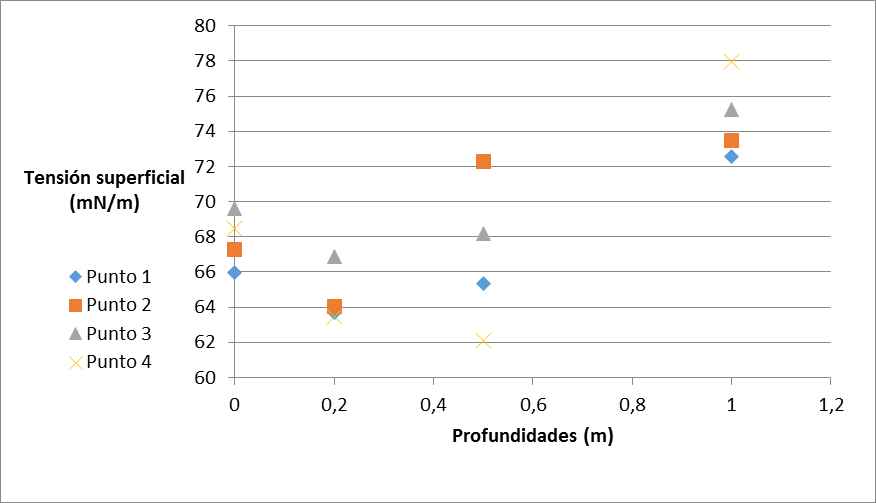 Punto 1: Máximo valor promedio de tensión superficial es 85,05mN/m para una profundidad de 50 cm y el menor 53,42mN/m para 1 m de profundidad.