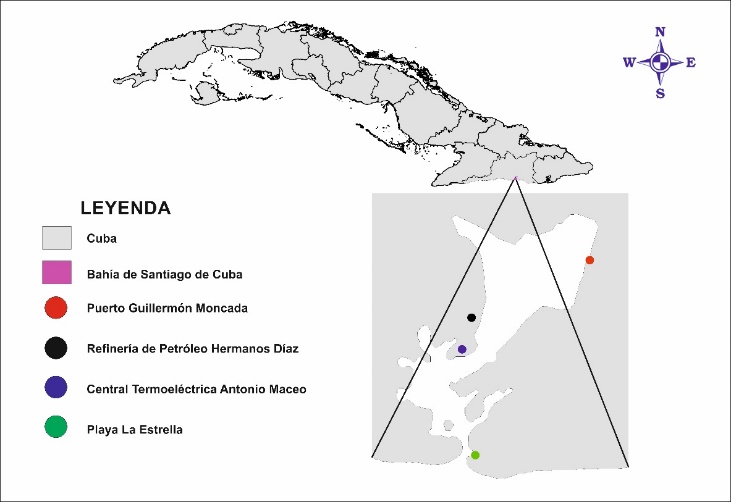 Se tomaron muestras de agua en cuatro puntos de la Bahía de Santiago de Cuba: el muelle del Puerto ‟Guillermón‟, la Central Termoeléctrica ¨Antonio Maceo¨, la zona comprendida desde el muelle de la lancha hasta el muelle de patana internacional de la Refinería ¨Hermanos Díaz¨, y la playa “La Estrella”. Estos puntos de muestreo se seleccionaron en función de su vulnerabilidad a los posibles derrames o fugas de hidrocarburos [17].