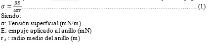 El método utilizado en el análisis de esta propiedad fue el método del anillo (tensiómetro de Du-Noüy). Este método se basa en medir la fuerza necesaria para separar un anillo de una superficie líquida; éste está suspendido a través de un brazo de palanca y de una balanza de torsión, mediante la cual se mide la fuerza. La tensión superficial o interfacial está relacionada con la fuerza para despegar al anillo y se calcula por medio de la expresión siguiente [22,23].