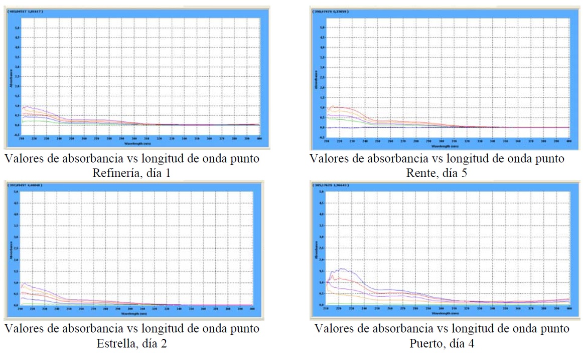 Gráficos de absorbancia vs longitud de onda para cada punto de muestreo.