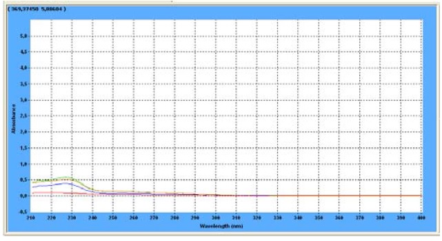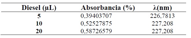 Para determinar la absorbancia a la muestra patrón de Diesel se utilizaron proporciones de 5 (curva azul), 10 (curva anaranjada), y 20 (curva verde) µL respectivamente. El mayor valor se obtuvo para la proporción de 20 µL de Diesel, a una longitud de onda de 227,208 ƞm