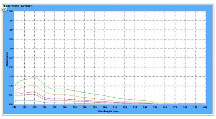 Se emplearon varias proporciones de la mezcla de hidrocarburos para realizar las curvas y determinar los valores de absorbancia, éstas fueron: 5 (curva anaranjada) ,20 (curva violeta), 30 (curva rojo) y 40 (curva azul) µL respectivamente. El mayor se obtuvo para la fracción de 40 µL de la mezcla de hidrocarburos, para una longitud de onda de 213,554667 ƞm.