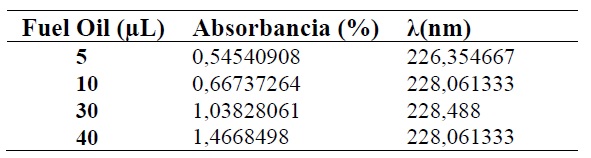 Para medir los valores de absorbancia a la muestra patrón de Fuel Oil se emplearon diferentes proporciones: 5 (curva rojo) ,10 (curva violeta), 30 (curva anaranjado), y 40 (curva verde) µL. El mayor valor se obtuvo para la fracción de 40 µL de Fuel Oil, a una longitud de onda de 228,061333 ƞm.