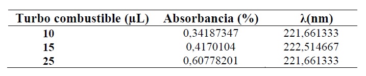 Valores de absorbancia y longitud de onda para la muestra patrón con Turbo combustible