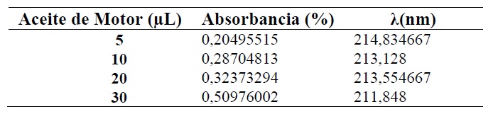 Valores de absorbancia y longitud de onda para la muestra patrón con Aceite de Motor