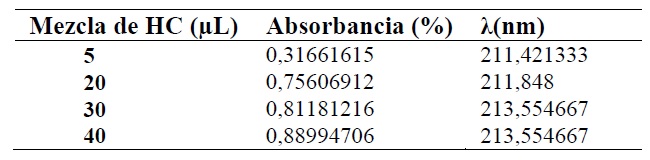 Valores de absorbancia y longitud de onda para la muestra patrón con Mezcla de HC