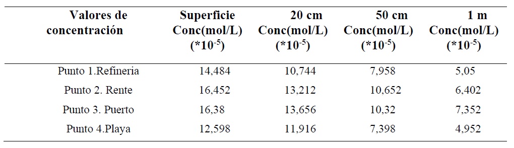 Los valores de concentración se determinaron a partir de los valores promedio de absorbancia, para las diferentes profundidades en los 4 puntos de muestreo, para comparar con los valores de concentración de las muestras patrones y poder inferir, por la similitud de los valores de concentración obtenidos, la presencia o no de hidrocarburos en los puntos seleccionados.