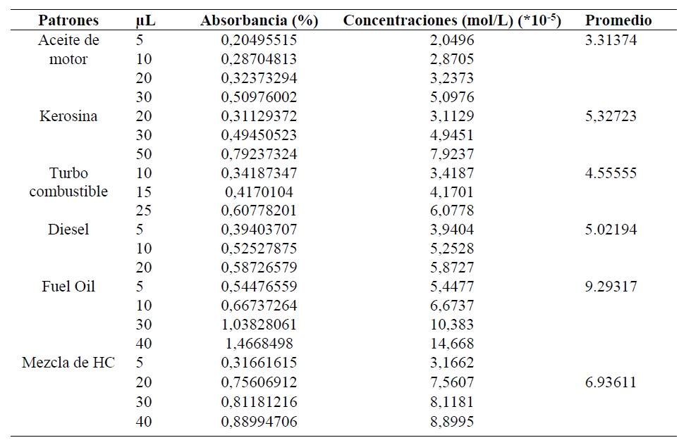 Los máximos valores de concentración se obtuvieron para una fracción de 40 µL del patrón de fuel oil con una cifra de 14,668*10-5mol/L así como para una fracción de 40 µL para el patrón de mezcla de HC con un valor de 8,8995*10-5mol/L.