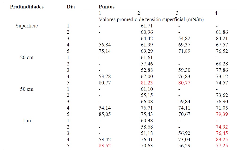 Los valores indican una tendencia variable, pues a medida que aumenta la profundidad están dispuestos en orden ascendente, descendente e incluso ambos, oscilando entre los 51,18 y 85,05 mN/m.