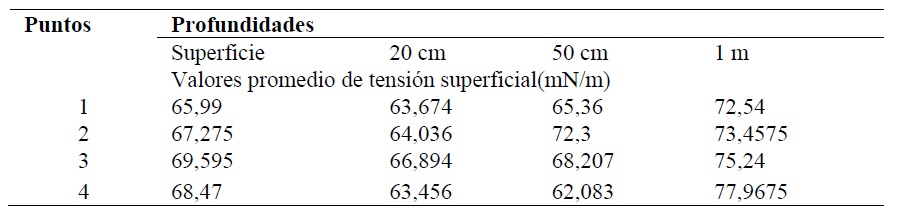 Valores de tensión superficial promedio para cada punto de muestreo por profundidad.
