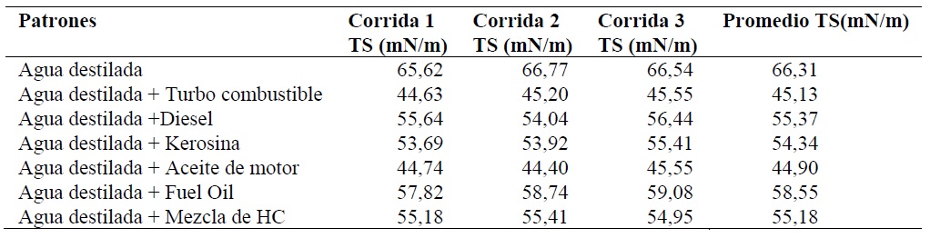 Los valores de tensión superficial del agua destilada pura, presentan el valor más elevado, lo que demuestra el efecto que poseen los hidrocarburos de disminuir dicha variable en el agua, ya que tienden a mantenerse fundamentalmente en la superficie. Esta característica se relaciona con las fuertes interacciones que existen entre las moléculas de agua, las cuales se debilitan con la presencia de los HC.