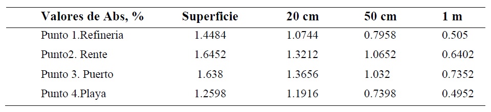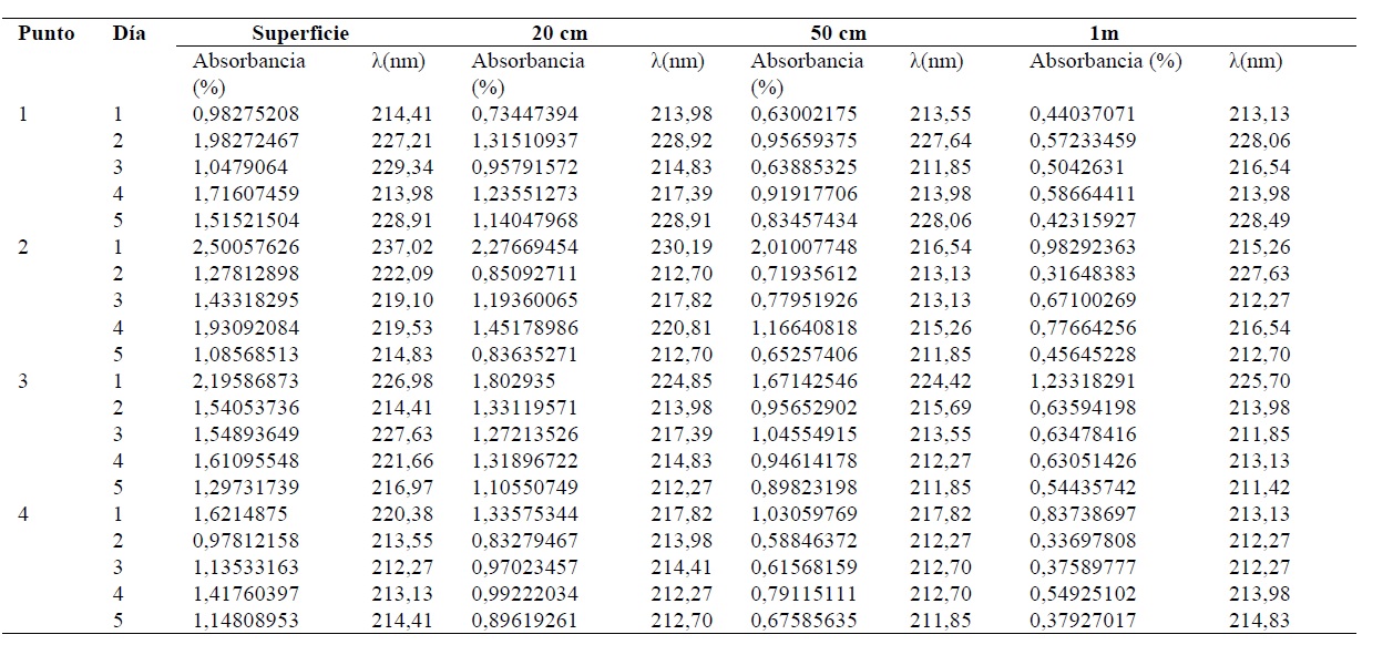Los mayores valores promedios de absorbancia en la superficie, corresponden a los puntos 2 y 3, siguen en orden decreciente los puntos 1 y 4. En cambio el comportamiento difiere en la profundidad siguiente (20 cm), los mayores valores corresponden a los puntos 3 y 2, y los puntos 4 y 1 en el mismo orden.